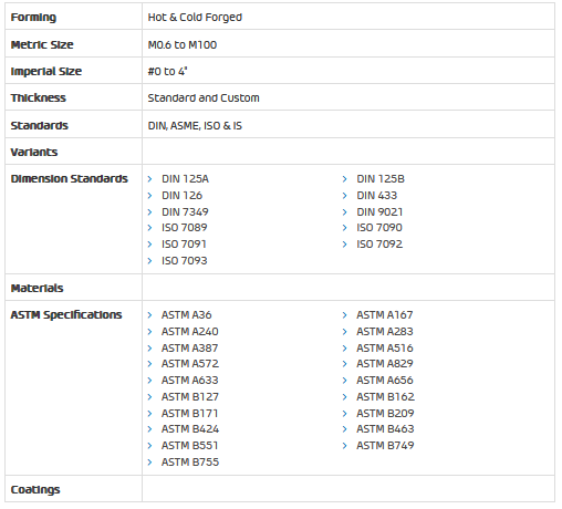 Plain washers are manufactured in metric and imperial size with standard and heavy thickness for high strength bolting. Flat washers are produced by die punching sheets, plates or strips of required material specification and trimmed for rough edges or sometimes can be machined from bar stock.