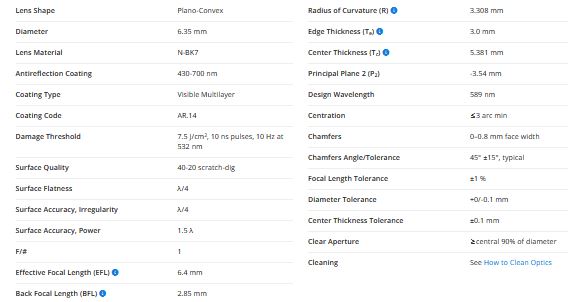 Plano-Convex Lens, N-BK7, 6.35 mm Diameter, 6.4 mm EFL, 430-700 nm.