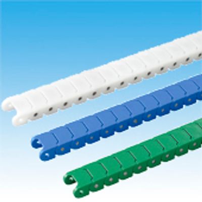 Plastic Block chain is a chain with a simple structure in which block-shaped links are connected with connecting pins. RS drive chain sprockets can be used, and a smaller chain pitch (9.525 - 25.4 mm) than the top chain allows for a smaller dead space for smoother transfers. Small chain widths (13-63 mm) allow installation in small spaces. Snap Cover chains with a plastic cover installed on a steel chain with large allowable load are also available. Selection can be made according to the load and the atmosphere of use.