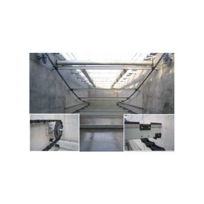 The scraper blades shaping, made of nylon reinforced with glass fiber, gives it extra long service life. The scraper can be adapted to all usual types of rectangular sedimentation basins either with surface or bottom scraping or a combination of the two.