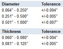 Many standard diameters are available with a broad range of thickness for each diameter. Tolerances for diameters and thickness are shown at below.