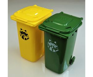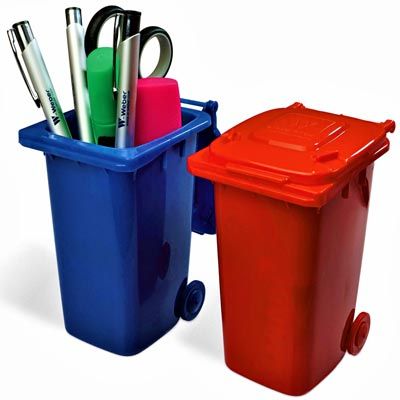 A detailed copy of our 240 litre wheelie bin. The 0.4 litre miniature waste bin is (as the bigger versions) resistant to UV-light, cold, heat and chemicals due to the manufacture by injection moulding of high-quality virgin raw material (HDPE). We use pollutant-free material - also approved for food packaging. Our mini wheelie bins offer many uses: desk-top waste bin, pencil holder, money or sweets box (in packaging). They can also be used for explaining waste management issues, e.g. the topic of waste separation in schools can be illustrated in a playful way. Available colours are grey, green, red, yellow, blue and brown - additional colours on request.Most popular related searches
