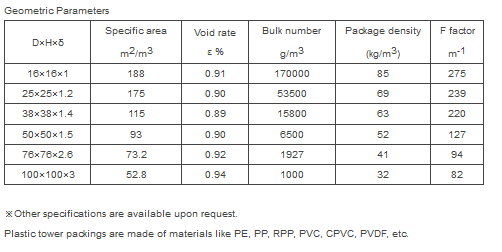 Plastic pall ring random tower packings have recently been used in many application fields which formerly were restricted to metals and ceramic materials.The application fields of the individual plastic materials are determined by chemical resistance, temperature stability and mechanical strength. Polypropylene is the most current thermoplastic in the production of tower packings. Due to its good resistance to chemicals at temperatures up to more than 100℃, polypropylene is superior to polyethylene in most fields.
