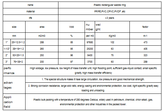 Plastic rectangular saddle ring is made of polyethylene (PE), polypropylene (PP), reinforced polypropylene (RPP), polyvinyl chloride (PVC), chlorinated polyvinyl chloride (CPVC), polyvinylidene fluoride (PVDF) and other tower packing. It has the characteristics of high void fraction, low pressure drop, low mass transfer unit height, high flooding point, full gas-liquid contact, small specific gravity, and high heat and mass transfer efficiency. These plastic bulk fillers operate at temperatures ranging from 60 to 280 degrees Celsius. Widely used in petroleum, chemical, chlor-alkali, gas, environmental protection and other industries of the packed tower.