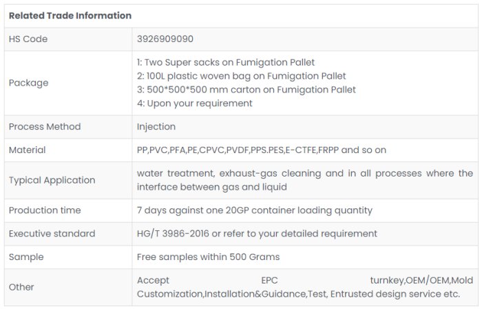 Plastic VSP Ring also called Mella Ring. Its structure is very similar with Nor-pak. External Rid &protruding Drip fins’ cross will promote gas & liquid evenly distribution and large size pore’s structure will avoid of Tower Packing’s internal plugging.Eight Arc Horizonal Bar that bends towards inside ensures liquid un-continuely renew. Meanwhile, Vertical triangle straight rod connected two Arc Bar largely speed up air-liquid exchanging speed.Owing to its rational symmetry, excellent inner structure, large free space, compared with plastic pall ring, its flux effiency is increase 15-30% , its pressure drop is reduce 20-30%.Therefore, Plastic VSP Ring is used in water treatment, exhaust-gas cleaning and in all processes where the interface between gas and liquid plays a decisive role.