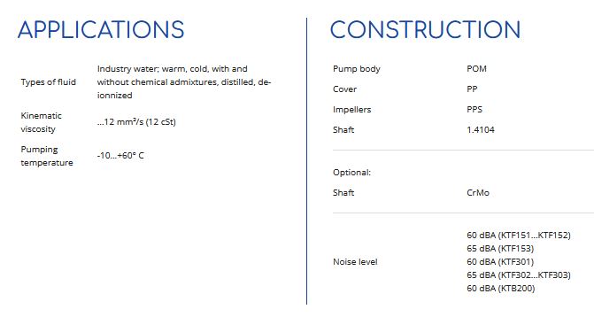 Immersion Pumps in Plastics series KTF and KTB are suitable for various water supply problems. These pumps are also suitable for a wide range of chemical liquids. No shaft seal is required, due to the construction.