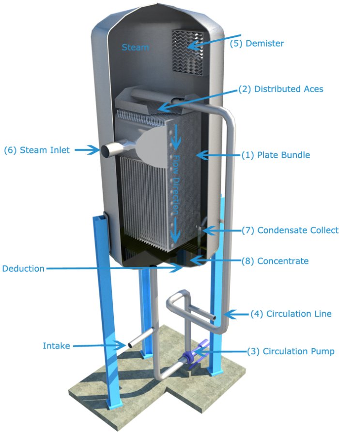 Falling film evaporators use gravity to convey the medium evenly over the heating surface from top to bottom and are therefore very energy efficient in operation. In the case of the plate falling film evaporator, the medium is passed over the heating surface of the plate bundle (1) heated from the inside in order to concentrate and evaporate it. Through the distribution cup (2) ensures uniform loading of all heating elements. The circulation pump (3) and the recirculation lines (4) convey the medium in a circle and is thus further evaporated. Evaporation of the more volatile liquid at the heating surface produces vapor vapor which escapes horizontally from the plate bundle and is conducted countercurrently upwards through the vapor outlet. Due to the available evaporator body, the resulting slow flow rate, to the medium opposite Brüdendampfstroms a very good separation of the liquid and vapor phase is achieved, which is why this type of evaporator work very efficiently and state of the art. Finally, the entrained droplets of the medium are separated in the Brüdendampf by a mist eliminator (5). The Brüdendampf can then be used to heat the plate bundle through the steam inlet (6) of the next evaporation stage at a Mehrstufeneindampfung or be used by mechanical vapor compression (MBV) or thermal vapor compression (TBV) in the same evaporator stage for heating the heating elements. The condensed Brüdendampf (condensate) inside the heating elements is finally collected and discharged by a condensate collector (7) at the lower end of the plate bundle. The concentrate (8), on the other hand, is drawn off at the lower end of the vaporizer body and directed to the next vaporizer stage or the next process stage.