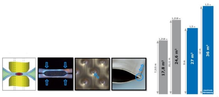 By welding the heating elements at regular intervals and integration of steam inlet and condensate collector as outlet, the heating coil is formed. The distances between the plates can vary between 19 and 48 mm. The number of heating elements and the choice of the plate format creates an evaporator heating surface, which is used to evaporate the low-boiling medium (especially water).