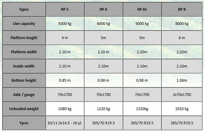 Front panel height 500 mm, High up adjustable beam 3 positions, Hydraulic braking, Suspension fastening onRP6Sand RP8, Stand with strengthenedwheel onRP5and RP6, Fixed fastening eye, Road ligths.