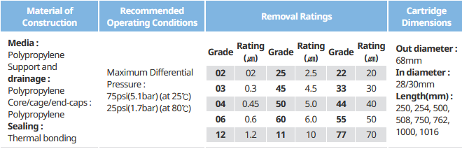 of micron ratings to meet clients` filtration requirements. All the Polypropylene components and thermal bonded manufacturing
