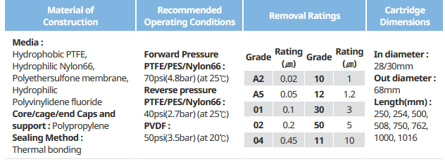 Hydrophobic PTFE, Hydrophilic PTFE, Nylon66 Cartridge Filters remove particles and micro-organisms greater than 0.2? from gases and liquids.