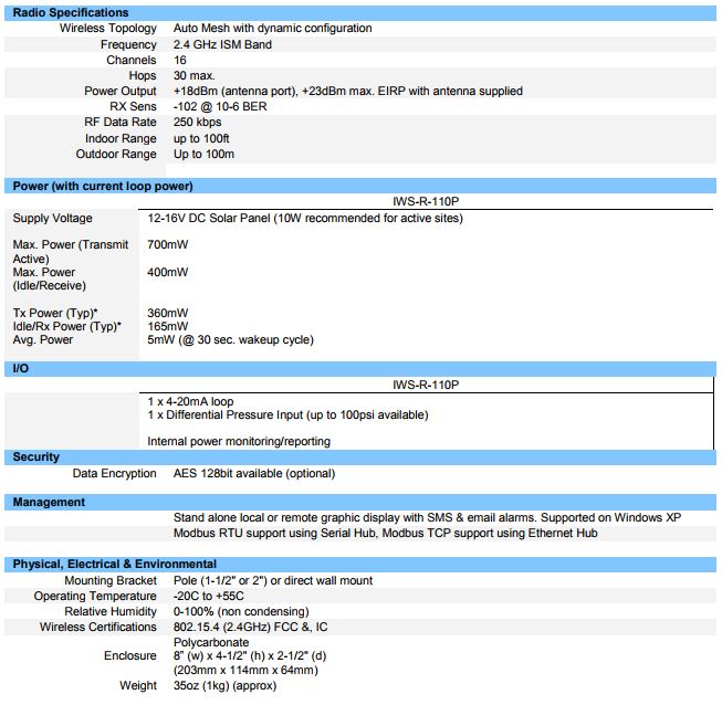The Intelligent Wireless System (IWS) nodes comprise ol a range of distributed wireless products from Plexus Controls providing advanced supervisory, control and data acquisition (SCADA) functionality for commercial and industrial applications. With `out the box` auto mesh wireless functionality, IWS nodes can be easily installed at a remote location and connected to standard sensors, supporting 4-20mA or 0-5V. Either through a direct wireless connection or automatically hopping through a series of other IWS nodes, the sensor data is relayed back to the IWS Hub for termination over Ethernet to the IWS Management Server application for display, logging and alarm management.