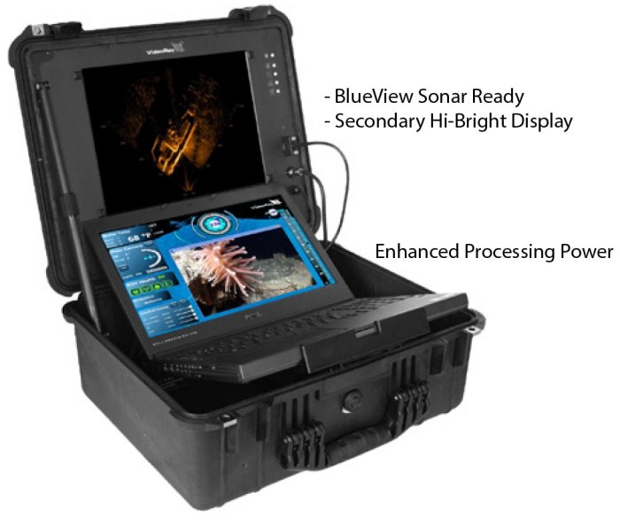 THE PRO 4 Plus BASE Remotely Operated Vehicle (ROV) system has been specifically configured to quickly and effectively perform advanced underwater imaging tasks. The Plus BASE ROV system is a portable and cost effective advanced solution that can be deployed in minutes and operated by one person if necessary. The Pro 4 Plus BASE system includes a Pro 4 submersible, Pro 4 Integrated Control Box (ICB) with a high performance Dell computer loaded with VideoRay Cockpit control software, secondary 15” Hi-Bright daylight viewable display, and an industrial hand controller. This system has enhanced processing power and is BlueView sonar ready (sonar not included).