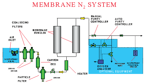 After the compressed air passes the final filter the air then enters the nitrogen membrane module(s) where the air separation occurs. Membrane technology works by filtering oxygen from the dry compressed air stream via hundreds of thousands of hollow, polymeric fibers each the diameter of a human hair to produce gaseous nitrogen.