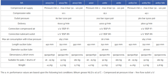 FLEXBIMEC pneumatic grease pumps are a well – proven product line since many years. The brass and aluminum alloy pneumatic motor assures a reliable use and a simple maintenance. The pumping system includes a rod in hardened steel, suitable also for heavy duty applications. The gaskets and seals are suitable for the use with almost all multipurpose greases on the basis of mineral oil from viscosity NLGI 000 up to NLGI 3. The choice of the suitable pump for the individual application depends a lot on the type and the characteristics of the lubricant that shall be pumped. Pumping grease means to move a high viscosity fluid which at the dispensing point presents a dense condition. The VISCOSITY of a fluid describes its capability to resist the movements of its particles.