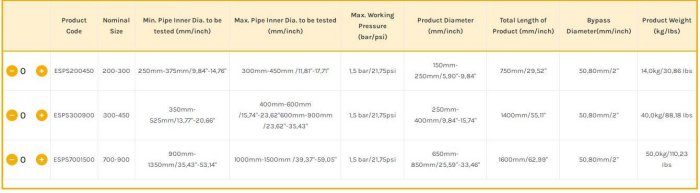 The pneumatic/Inflatable  multi size Egg Shape pipe test plugs have a bypass system to allow testing the pipeline and changing the fluid direction of the pipe. Egg shaped pipe test plugs are available in different sizes for sealing, blocking sewers, drainage systems, pipelines and gullies, testing pipe, bypassing flow with bypass channel. These test plugs are used to sealing, blocking egg shaped, ovoid or oval profiles of sewers, drainage systems, pipelines, and gullies for testing with air or water. Working Pressure is 1 Bar and Back Pressure is 0,5 Bar for all sizes of Egg Shaped Test Plugs. They are available for pipe diameters from 200 mm (7,87") to 1500 mm (59,05"). Specified as standard working pressure1,5 Bar (21,75 psi).