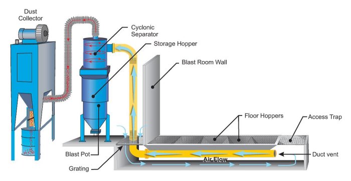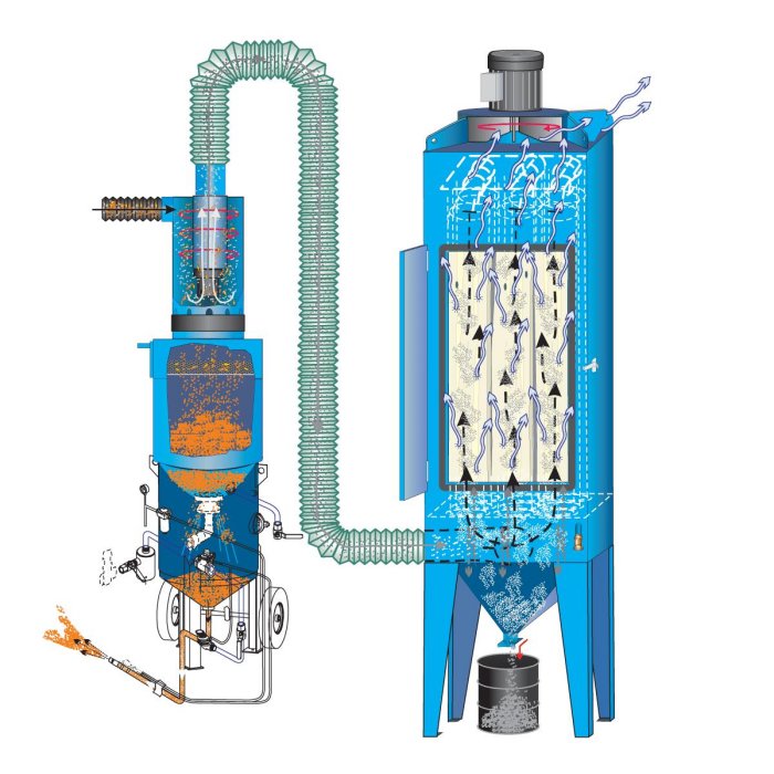 - Light particles – dust, paint chips, rust, scale, shattered media, etc. are drafted up and diverted to the dust collector.