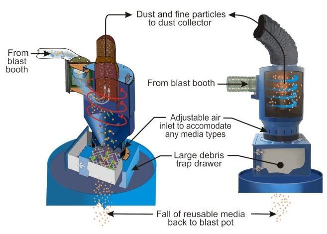 An improperly configured abrasive recovery system will either exhaust the entire dirty media mix – including good media – to the dust collector when too much air is allowed into the vortex, or rather the opposite, a vortex that is too weak will allow light particulate matters to fall down into the blast pot, which will negatively affect the impact of the media stream onto the workpiece and produce too much dust during operations.