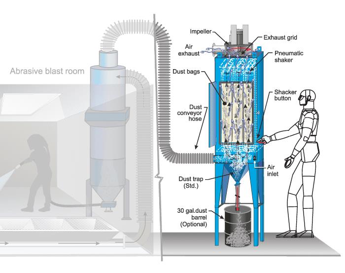 This dust collector operates independently from the blast booth’s main dust collector, which is designed to draft away and collect airborne contaminants floating in the air during blasting operations.