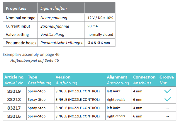 Right and left version for an easy installation on the boom. Electropneumatic valve assembly no longer necessary. The switching of the nozzle is done directly on the nozzle body.