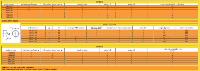 Pressure gauges for all non-corrosive fluids at temperatures between -20 and +80 °C, compatible with copper and its alloys (always indicate the utilized fluid). Precision amplifer movement in brass. Dial in stove-enamelled aluminium.Pressure gauge parts: – Bourdon tube in copper alloy for pressure ratings from -1 to 40 bar. – spiral tube in copper alloy for pressure ratings from 50 to 1,000 bar.Welds in tin alloy. Protection degree Ip 32. Particularly suitable for compressors, pressure reducers, pumps and any other use in the plant and industrial air-operating sector.