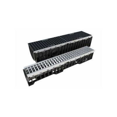 According to the standard EN 1433, it supports two loading classes : B125 and C250. The range consists of 8 channels with 3 widths and 4 heights : 100/55, 100/80, 100/100, 100/160, 150/100, 150/160, 200/100, 200/160. It is composed by 3 different types of grids (slotted, square mesh and anti-heel mesh) realized from galvanized steel or nodular cast iron.