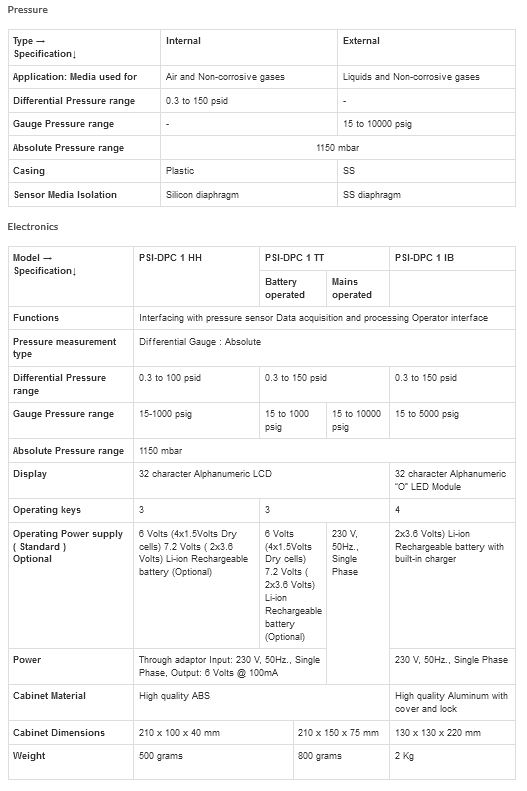 Model PSI-DPC-1 is a compact instrument, which comes in three models namely PSI-DPC-1-HH, PSI-DPC-1-TT and PSI-DPC-1-IB which are distinguished in respect of the cabinet, operating power supply and maximum measurement range and are similar in all other respects. PSI-DPC-1-HH is a battery operated, hand held instrument and is normally used for pressures up to 100 psi full scale with internal sensor.