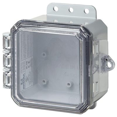 4″ x 4″ x 3″ high impact polycarbonate enclosure with hinged clear cover. Integrated locking latch and mounting flanges provide a 100% metal-free enclosure with no hardware required. Protection Rating: UL/cUL NEMA TYPE 6P IP68.