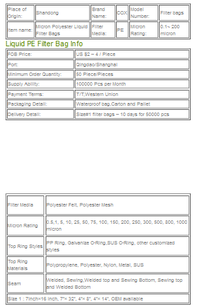 Liquid Polyester(PE) filter bag available from 0.5 micron to 200 micron. Plastic, carbon steel, stainless steel neck