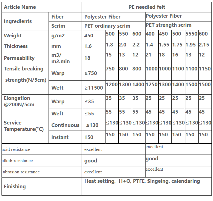 We choose different type fineness polyester fiber make into the gradient type structure filter material, make the product not only have the common felt`s advantage of high voidage, good air permeability, high dust collecting efficiency, long service life, etc. But also have the advantage of the moderate temperature rating, can reach 150? at the moment, moderate effect of the anti-antacid and anti-alkali, and has very good abrasion resistance. According to the different requirements of different working condition, surface treatment can be done as singeing, calendering, oil and water proof, PTFE impregnation, coating, laminating process, etc. It can be used in cement, steel, food and other soot filter use.