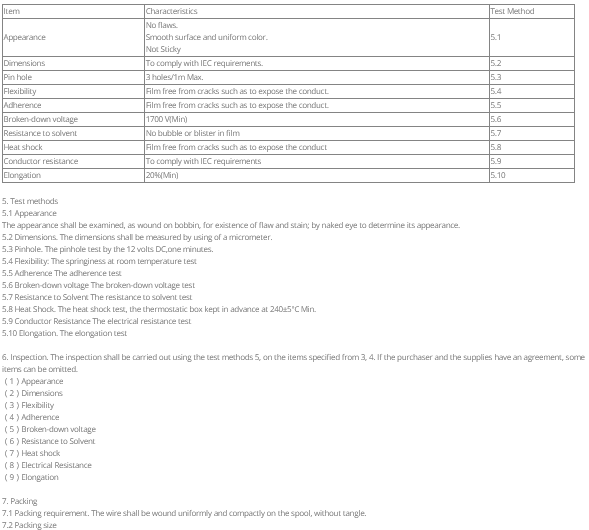 The characteristics of wire shall comply with table 2, when tested by 5.0.