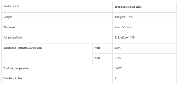 The Air Slide Fabrics are available in thickness of 4mm, 4.8mm, 5mm, 6mm and 8mm and up to a width of 1650mm. It is available in construction of Polyester Spun x Polyester Spun yarns.