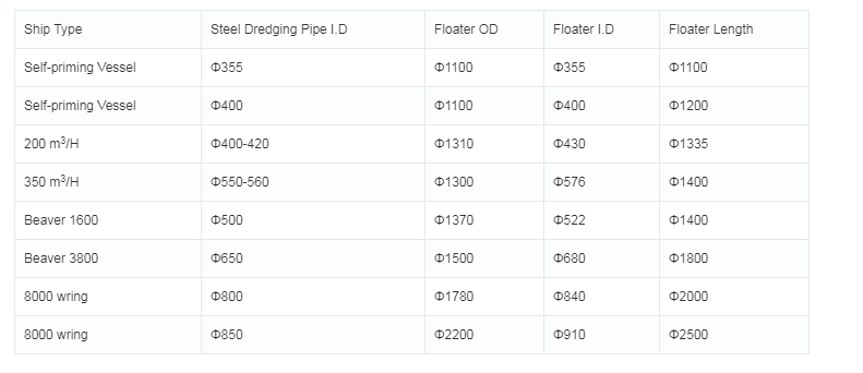 1. 2 pieces of floaters form 1 set, 2 sets of floaters form 1 pair. 1 pair of floaters could float 6 meter long steel dredging pipe and 1.5m long rubber hose.