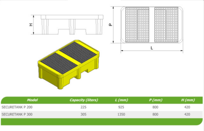 Spill sumps range for drums or jerry cans made in polyethylene and gird in polypropylene. Palletized to facilitate the handling in empty and cleaning. Suitable metal supports or polyethylene allow the realization of custom storage zones adapting to the individual needs.
