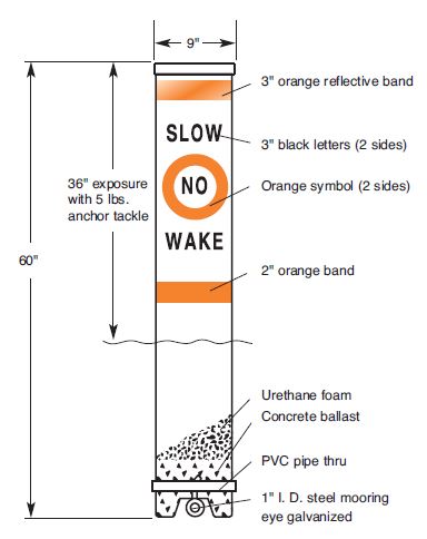 Features: 9" dia. white super-tough HDPE shell. Ultraviolet inhibited. Shatter-proof — will not crack, chip, peel or rust. Completely urethane foam filled. Virtually unsinkable. 3"-wide reflective band at top provides excellent night visibility. Self-righting without tackle. Recessed cap allows buoy to stand upright. Heavy steel galvanized anchoring eye cast in an internal concrete ballast. Inland waterway marking symbols with standard messages included. Includes choice of standard symbols and messages.
