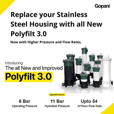 The all new and improved third generation Poly Vinyl Chloride (PVC) filter housings from Gopani have excellent resistance to UV and atmospheric oxygen. The Polyfilt bag filter housings and the cartridge filter housings are now powered with increased operating pressure, better hydro pressure, and higher flow rate.