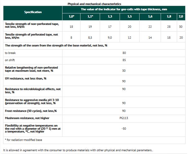 ARMOCELL geo-cells are a flexible three-dimensional structure (module) made of polymer tapes (ribs) fastened together and staggered. Under tension, the structure is transformed from a batch form into a bulk (cellular) form so that cells are formed that are intended to be filled with bulk material. The production of geo-cells is implemented using the latest technology, using a unique method of polymer modification, which allows to produce a volumetric geogrid with a thickness of 1 mm, improving its technical properties. In the production of primary raw materials are used, which gives geosots increased strength.