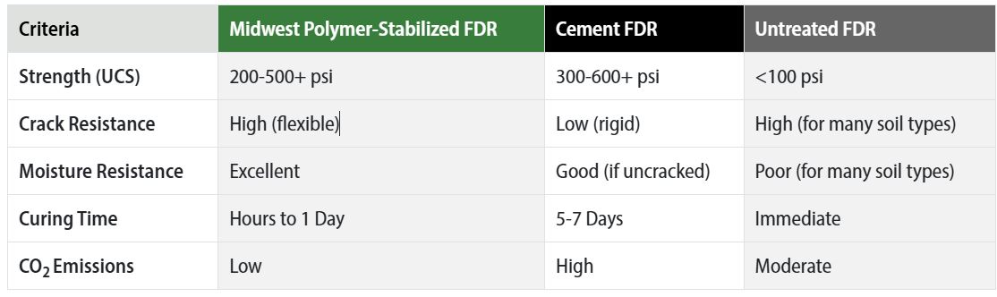 Our solution delivers meaningful strength gains — often exceeding 200 psi UCS — providing a stable and durable base suitable for a wide range of road applications. While cement stabilization can produce higher compressive strength in some cases, Midwest’s polymer-stabilized FDR provides strong, flexible performance without the rigidity or environmental drawbacks of cement.