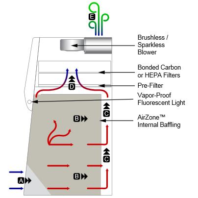 - AirZone™ baffling establishes a proper horizontal airflow pattern and directs toxins away from the operator in a predictable pattern, eliminating "dead spots" within the hood