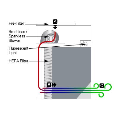 B Air moves to the rear of the bench and exits through a HEPA filter.