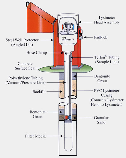 After a borehole is drilled, a Monoflex Lysimeter installation can be completed in a minimal amount of time. Monoflex offers a variety of lysimeter accessories such as well head assemblies, flexible plastic tubing, vacuum pumps, flush thread lysimeter extension casing, Stainless Steel centralizers and steel well protectors.