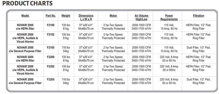 The Novair 2000 Portable Air Filtration for use in abatement, hospitals, air scrubbing, or anywhere dust is a concern. Available in a variety of power sources (110v-220v 50/60Hz) and filter configurations.