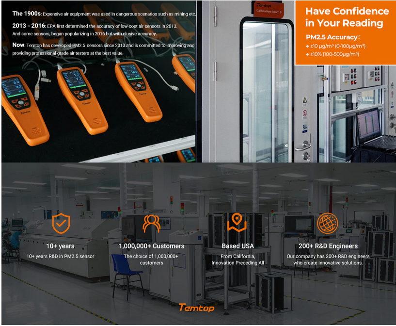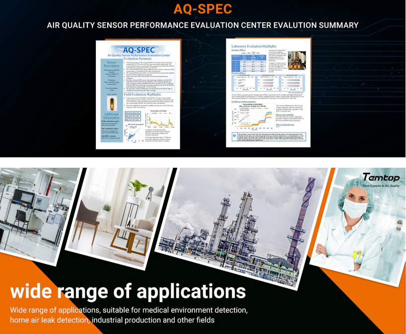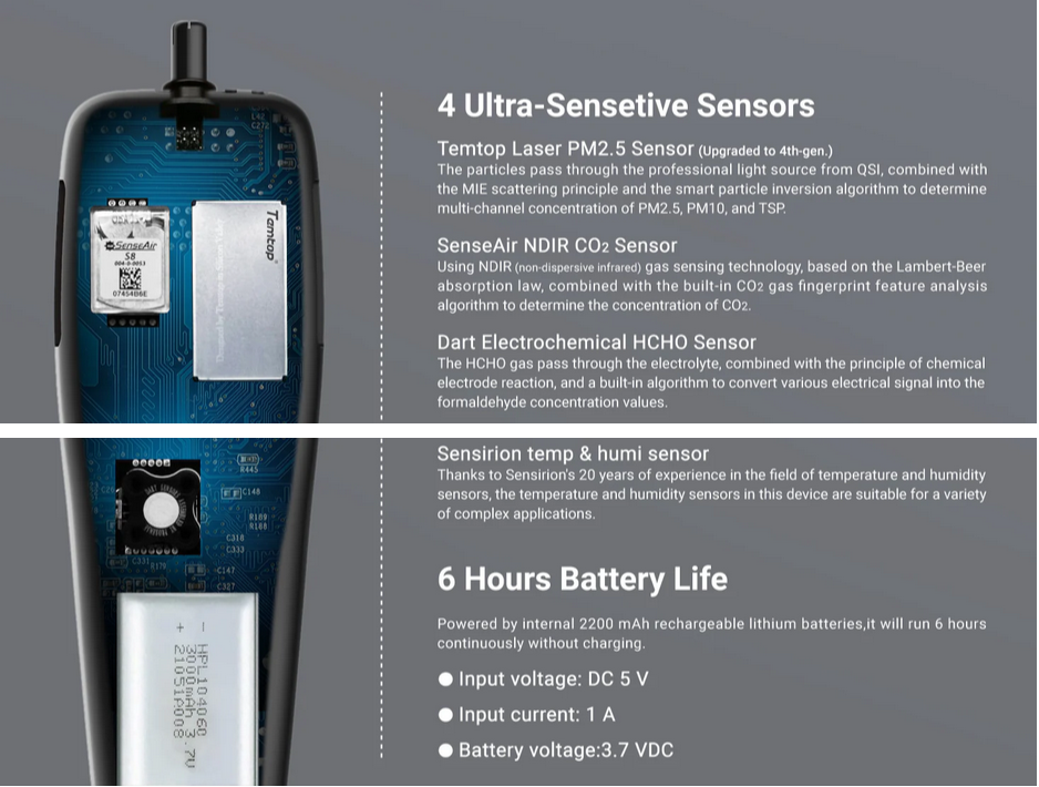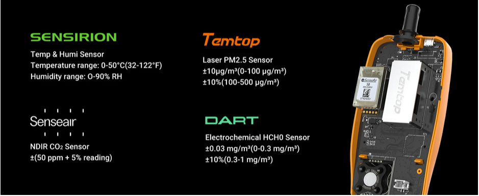 This product is fast-responding and sensitive. It uses a American Temtop PM sensor, a Swedish SenseAir NDIR CO2 sensor, a British Dart formaldehyde sensor and a Swiss Sensirion Temperature & Humidity sensor.