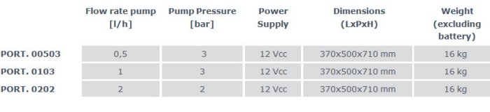 Fully preassembled compact dosing system, designed to meet the challenges related to chlorination of sources or water intakes without power supply or for urgent interventions. The system is equipped with an electronically-controlled electromagnetic dosing pump with low voltage 12 Vdc power, special edition with low absorption version and both manual and automatic control for flow measurement. Complete with containment dikes for reagent tank 10/20 liters and stationary battery protected compartment. The electronic instrumentation is separated from the hydraulic components to ensure total safety of the plant.