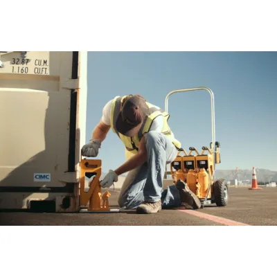 The Bison C-Jacks are certified industrial scales engineered for precision weighing of ISO shipping containers with an accuracy of +/- 0.2%. These portable scales attach to the corners of a container to provide a digital weight readout on a user's smartphone via the Bison VGM App, offering essential data management capabilities such as logging gross weight, seal IDs, and photos. Engineered to serve a variety of industries including export, bulk loading, and military logistics, the C-Jacks eliminate the need for traditional weighbridges and reduce transport costs by allowing on-ground weighing of containers up to 35 tonnes (77,000 lbs). The system can be set up by a single person in under four minutes, providing a rapid and efficient solution for both grounded and elevated containers. A wireless handheld display ensures real-time weight monitoring during loading, and the scales support versatile container sizes and types, enhancing operational efficiency without delays.