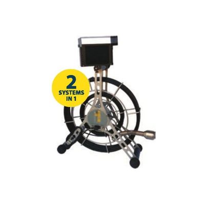 Two Systems in One. Inner reel contains small camera with a more flexible cable for those small access inspections with tight turns; outer reel has a larger camera with a stiffer cable for larger inspections. Ideal for longer and larger diameter inspections.
