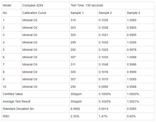 Conforms to the specifications of: ASTM D4294, D5059, D6481, ISO 20847, ISO 8754, IP 496, IP 336, JIS K 2541-1