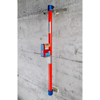The sensor is based on the pendulum characteristics of a mass disk, of which the movement is measured capacitively. This sensor is mounted on a carbon fibre bar of 1000 mm length which acts indifferent to temperature. The measuring points are spherical set bolts embedded in mortar. This setting device ensures a reliable reproduceability.