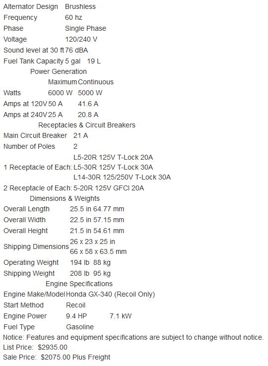 6kW 120/240V, Honda GX340