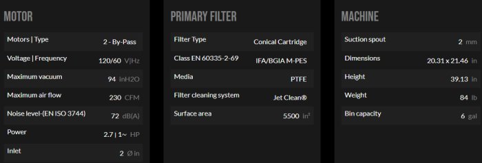 A robust polyester filtering cartridge is responsible for ensuring effective filtration. Despite its compact size, the cartridge is designed to provide a large filter surface area of 5500 in2. This allows air to pass through even when the filter becomes dirty. The filter is certified as M Class (BIA | EN 60335-2-69), meaning it effectively captures particles down to 1 micron in size, thus protecting both the motors and the operator from potential harm.